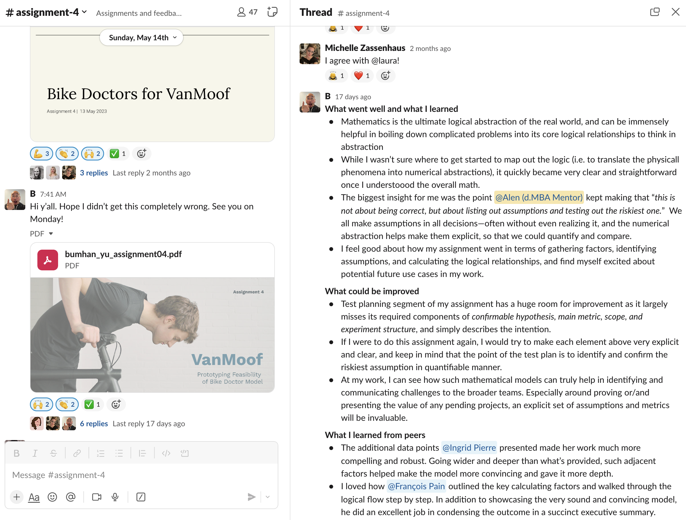 Furthermore, you have access to the community at all times. For example, there is a Slack community where you can ask questions, join discussions, share resources, and talk about your challenges.