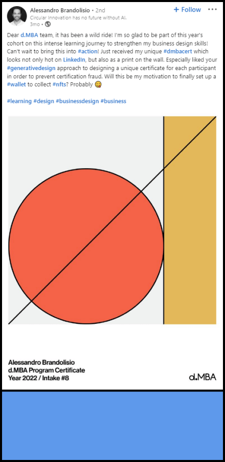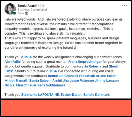 Each cohort of 50 students has a dedicated mentor and two tutors, who will guide you through your learning experience. The d.MBA mentors have deep expertise and experience in the intersection of business and design worlds. Typically, they work as business designers at top design agencies (Fjord, Designit, IXDS, etc.) across the World.