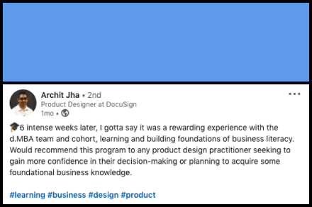 The course was designed for busy practitioners who have full-time jobs. So, the d.MBA requires roughly 10–12 hours per week. Most students find the time for the course on weekends but some get a day or several hours off their weekly schedule to invest in the course. Our completion rate of 97% also indicates the program is completely doable along your job.