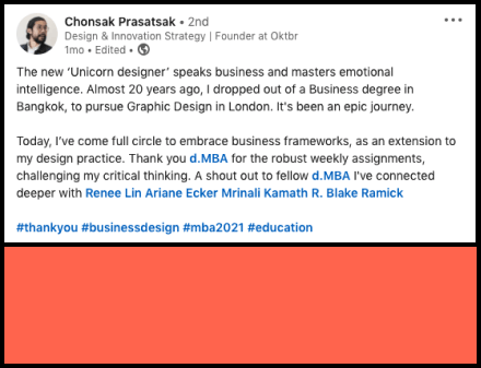 There are no grades in the d.MBA. Every student joins the program with the best intention of learning about business and increasing their confidence. The program is rather built around feedback and reflection process, which is fuel for our growth and impact.