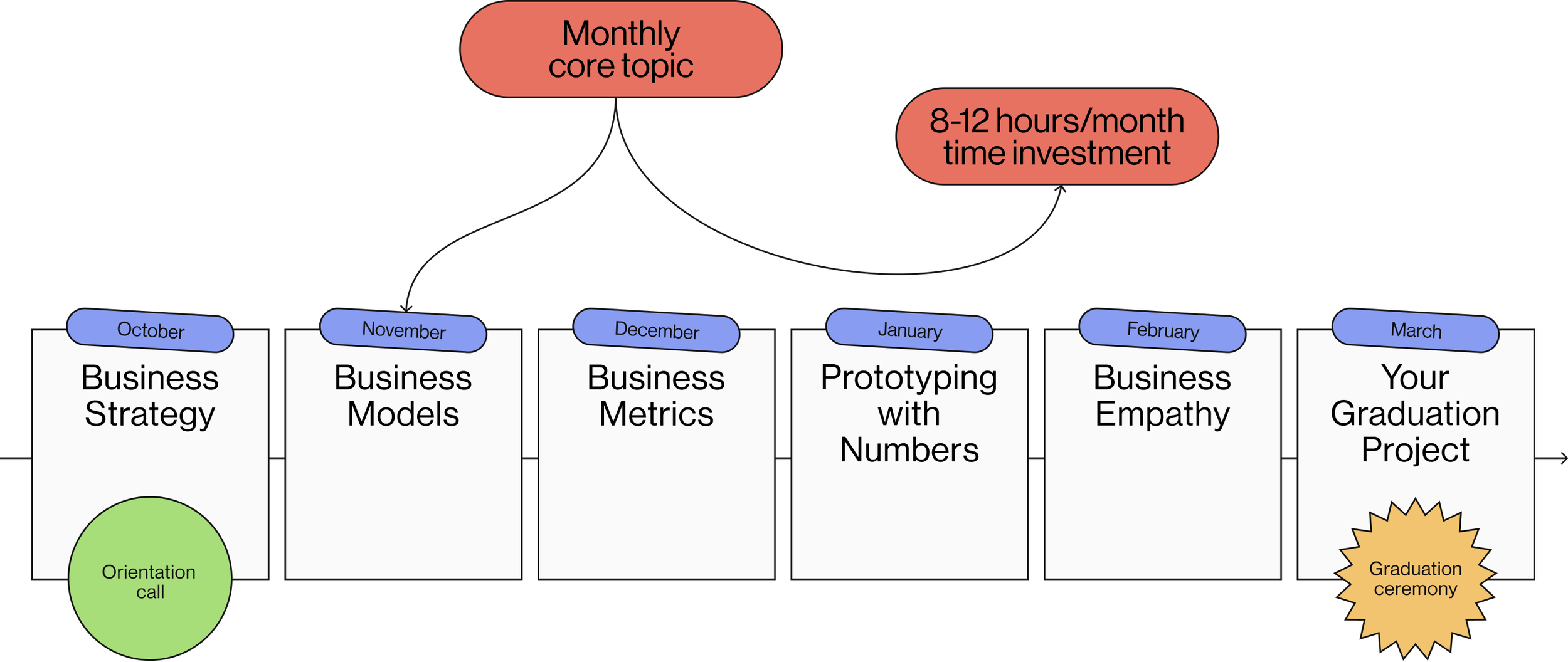 The d.MBA is designed for full-time professionals, striking a perfect balance between structure and flexibility. Led by seasoned business designers, you’ll be guided through 1 monthly core topic towards your personal graduation project.
